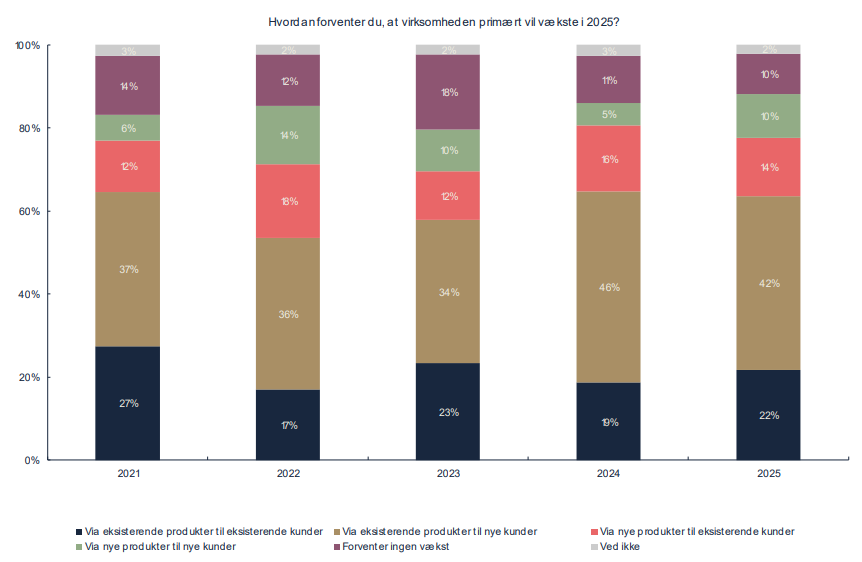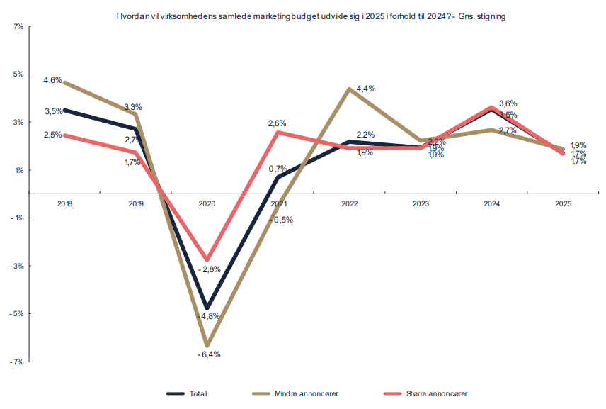Når vi kigger i analysen, så forventer 88% af marketingcheferne vækst i 2025. Det er næsten identisk med sidste år, så der er masser af tro på fremtiden. Men samtidig viser analysen, at marketingbudgetterne kun stiger med 1,7%, hvilket er det laveste niveau i flere år.